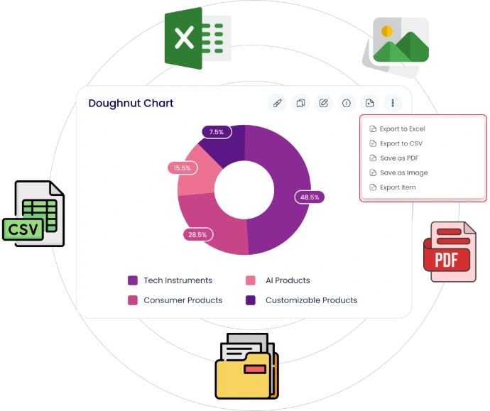 Download or transfer dashboards and charts in Excel, CSV, PDF or PNG formats.